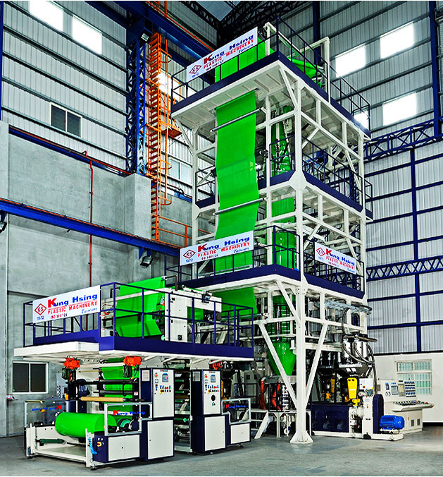 Many problems or defects (such as uneven rolls, gauge variation, wrinkles, gel, shark skin, unstable gauge for each layer, and maintaining output) may occur in Blown Film Multilayer Extrusion Lines and Plants. Only an experienced manufacturer can help identify and define a defect and narrow down the list of suspects causing the issues, in a short time. And only a blown film extrusion plant manufacturer with lots of manufacturing experience can give immediate solutions and be able to assist you in your film operations. Multilayer films require various resins to achieve specific properties in the final structure, and also to improve processability during film production and converting.The right manufacturer can share and communicate their valued-experience and knowledge of blown film extrusion formulas to guide you to select the best fit resins that balance cost and function. Repairs of 5 layer blown film lines and machines become more challenging than mono and 3 layered lines. A good manufacturer needs to be able to be available for the long-term so that you can get immediate service when repairs or spare parts are needed in the future. At Kung Hsing (KS), there’s a case where one blown film line was purchased 30 years ago, and is still operating in the customer’s factory with full support of spare parts. A good blown film manufacturer can provide powerful knowledge and insights, which leads to improvements to their existing processes or products. Which also leads to an increased efficiency! In addition, the developments in resins have changed in recent years, while machine designs are becoming more sophisticated. In Taiwan, as a leader in blown film extrusion, mature vertical integration of upstream and downstream value chains help companies to reach cost-effectiveness by controlling all aspects of blown film lines and machines. They have more control over their production processes in order to maintain higher quality control of their products. Popular Types of 5 Layer Blown Film Lines