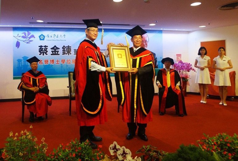 光興塑膠機械廠股份有公司董事長蔡金鍊(右),獲頒國立中正大學名譽博士學位。 李崇淦/攝影