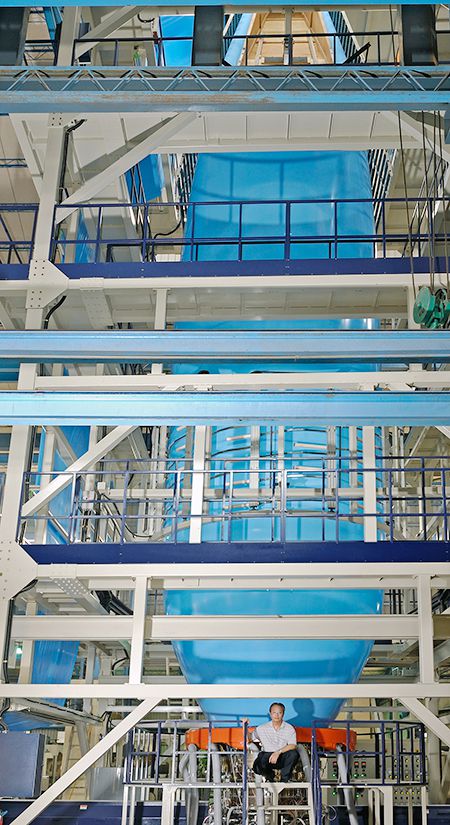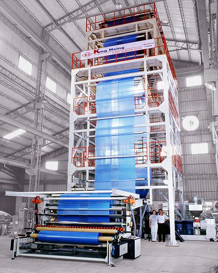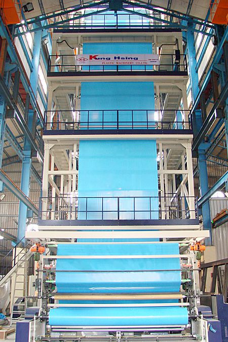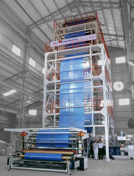 | 增選設備 | 重量式進料機、厚度測量、寬度控制器、(IBC)電腦控制內部冷卻系統、電腦同步線速控制。自動料斗裝載機、膜表面處理機、壓力錶、旋轉模具、雙站表面捲線機、震盪引取設備、冷卻機、熱分條設備、邊緣位置控制、電子張力控制、PIB 泵系統、起重機模具、風井、五層共擠模具 | ||||